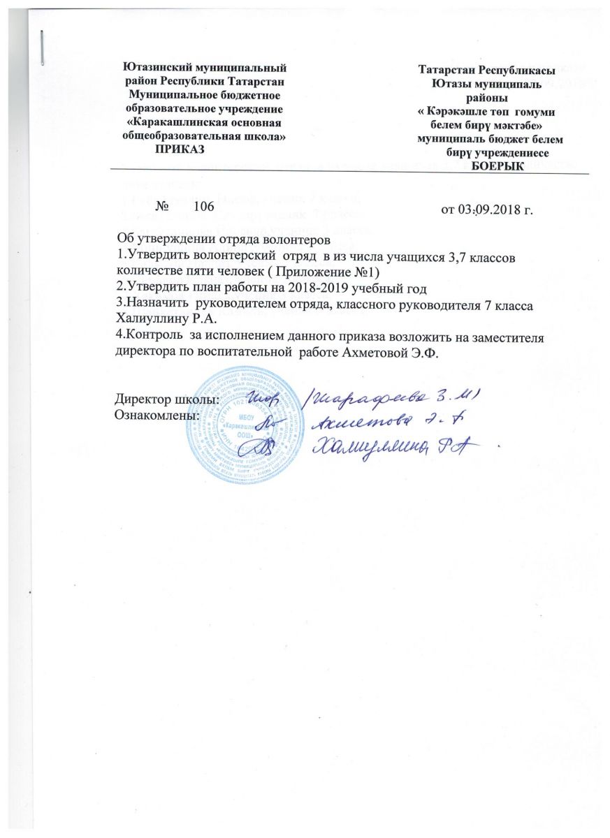 Приказ на 2018-2019 учебный год отряда волонтеры
