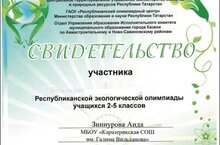 4 нче сыйныф укучысы Зиннурова Аида 2-5 нче сыйныфлар өчен республика күләмендә уздырылган экологик олимипадада катнашты.