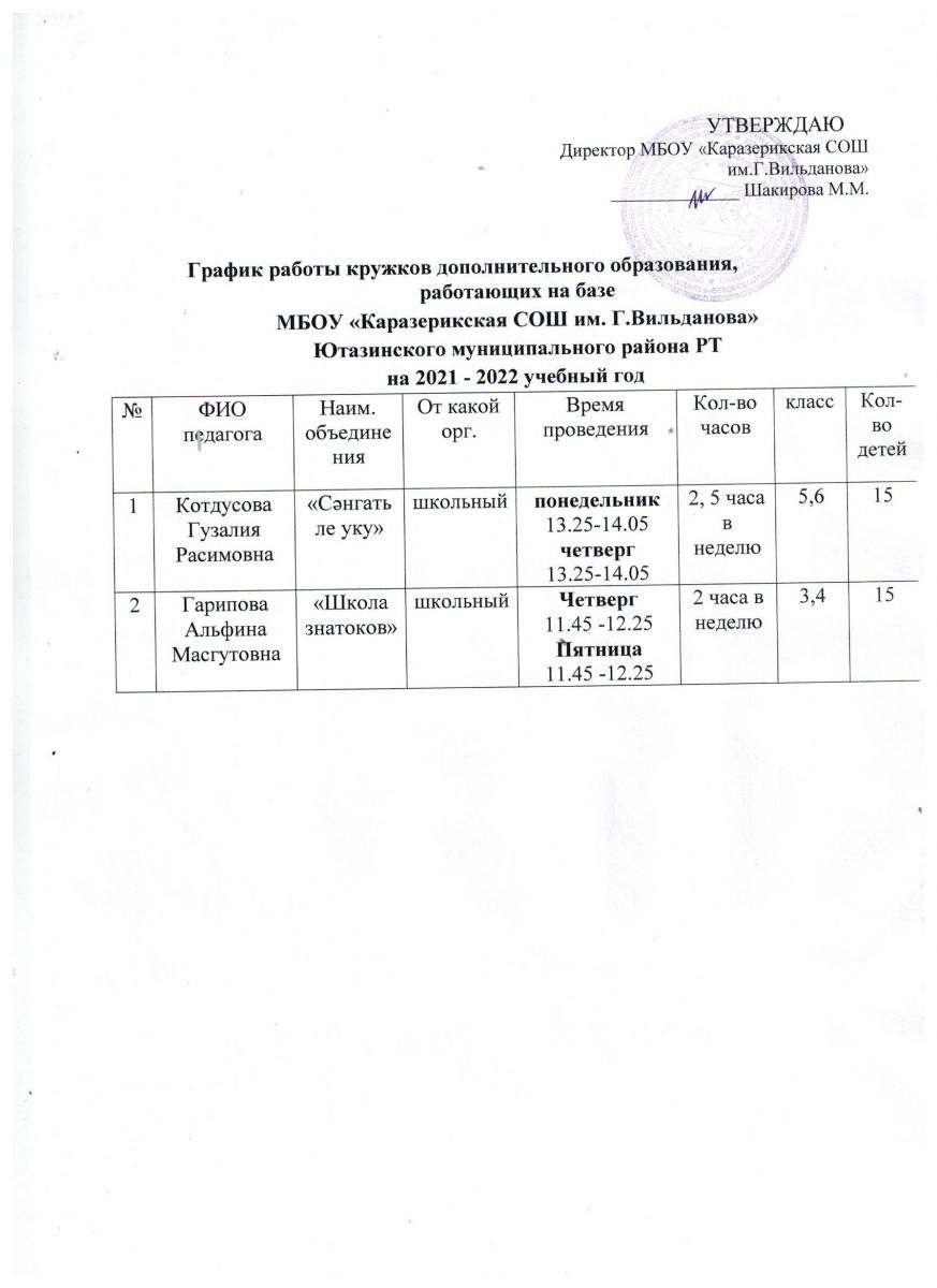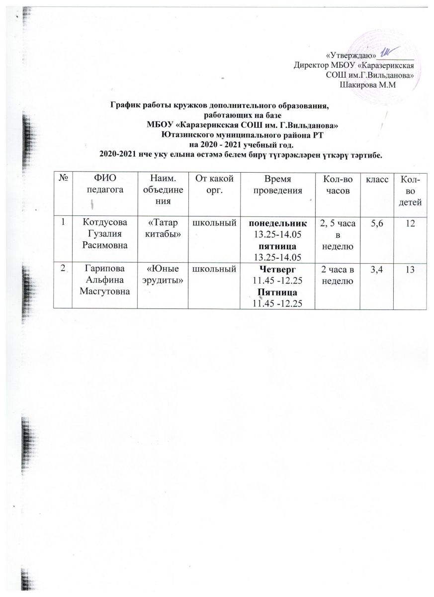 Гарфик работы дополнительного образования за 2020-2021 учебный год
