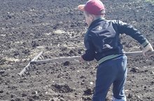 Раяз әбисенә бакчада яшелчәләр утыртырга булыша. / Раяз помогает бабушке сажать овощи на огороде.