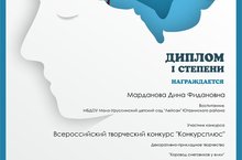 Наша воспитанница Марданова Дина участвовала во Всероссийском творческом конкурсе "Конкурсплюс". И в номинации "Декоративно-прикладное творчество" за работу "Хоровод снеговиков у елки" получила диплом I степени.