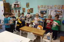 Во время деятельности дети поехали в гости к Зайчику на день рождения. Подарили подарки, пели "Каравай". Познакомились с друзьями зайчика, с Ежиком,с Белкой, с Собакой и с Мишкой.