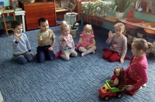 Игра: "Мишка на машине". (Один ребенок возит мишку на машине и говорит: "Кто к нам приехал? На чем он приехал? Какой он?")