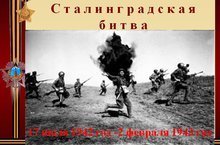 Сталингра́дская би́тва — одно из важнейших сражений Второй мировой и Великой Отечественной войн междуКрасной армией и Вермахтом при поддержкеармий стран "оси". Происходила на территории современныхВоронежской, Ростовской, Волгоградской областей иРеспублики Каллмыкии с 17 июля 1942 по 2 февраля 1943 года. Учащиеся 6 класса на классном часу ознакомились с командующими фронтов, силами сторон.