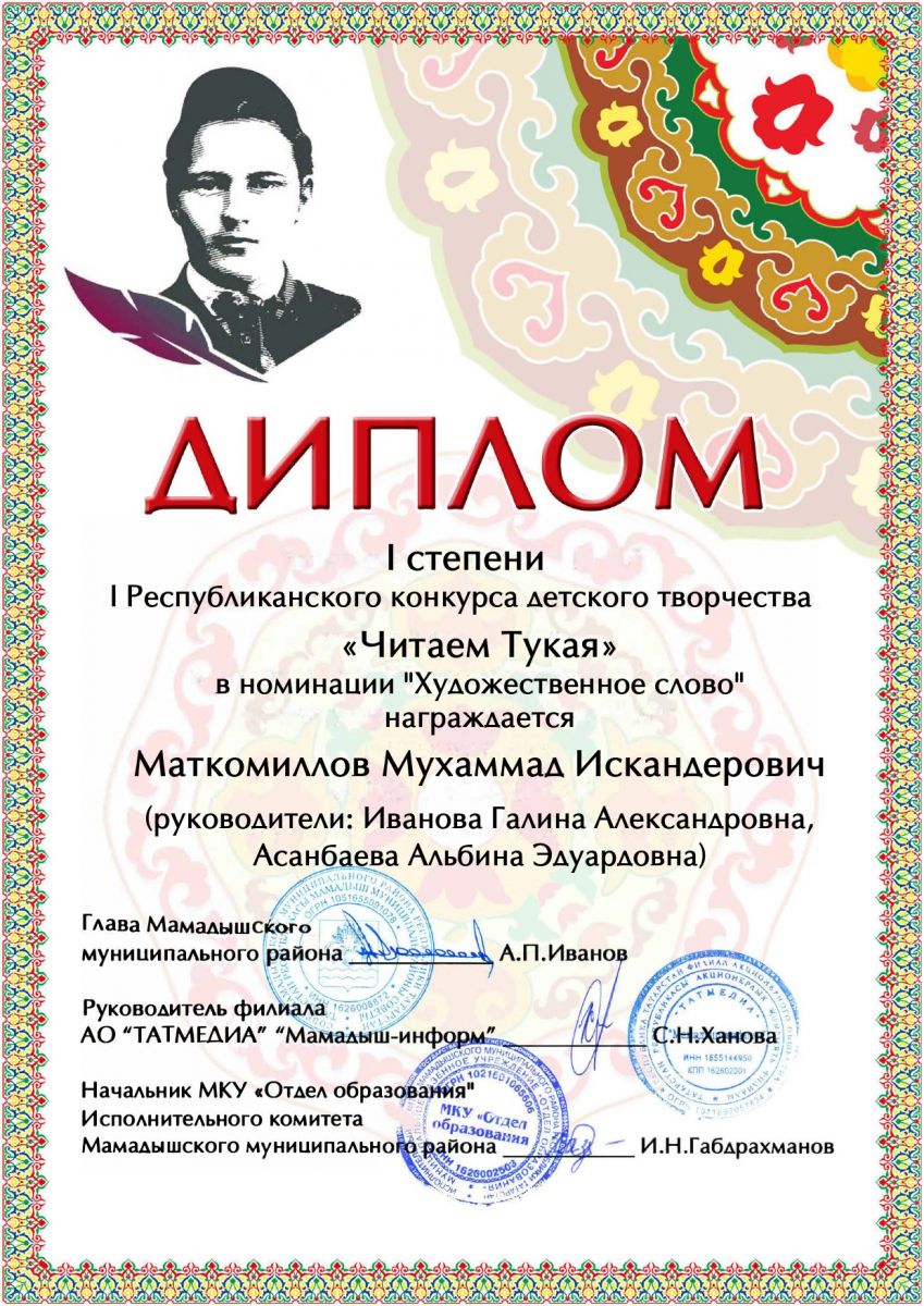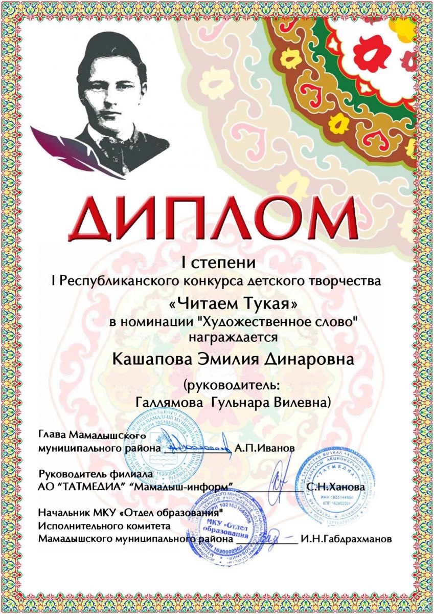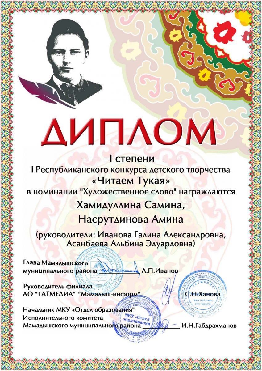 Дипломами 1 степени за участие в 1 Республикпнском конкурсе детского творчества"Читаем Тукая" ,награждены: Маткомилов Мухаммад за стихотворение : "Родная деревня"; Насрутдинова Амина (5 лет)и Хамидуллина Самина (6 лет) за постановку " Бала белэн кубэлэк"; Кашапова Эмилия (4 года) за стихотворение "Минем гаиләм". Руководители Воспитатель по обучению детей татарскому яыку Иванова Г.А., воспитатель Асанбаева А.Э.