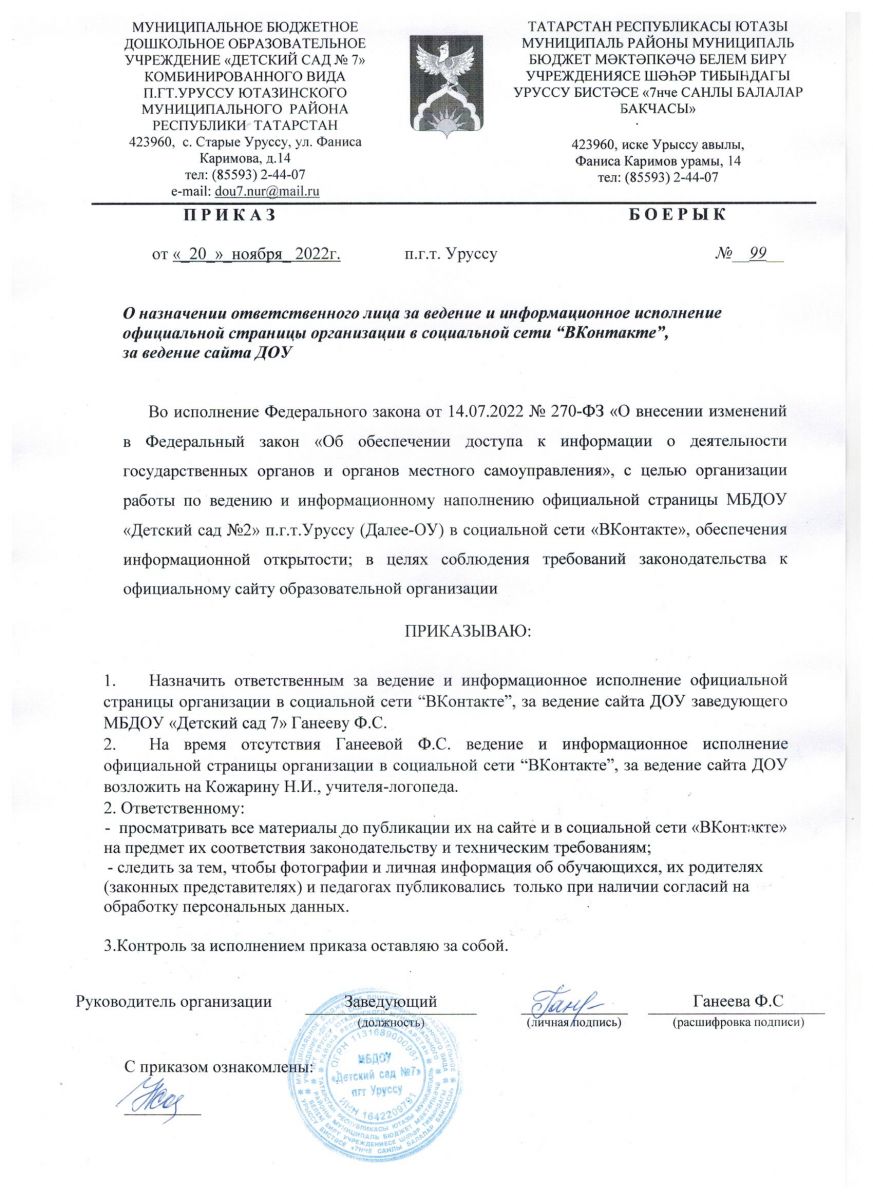 Приказ о назначении ответственного за ведения сайта и соц.сети "ВКонтакте"