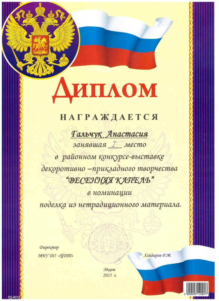 /Диплом 1 степени в районном конкурсе - выставке "Весенняя капель". (Гальчук Анастасия).jpg