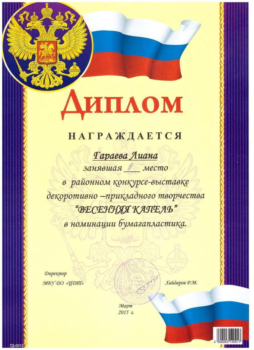 /Диплом 2 степени в районном конкурсе - выставке "Весенняя капель". (Гараева Лиана).jpg