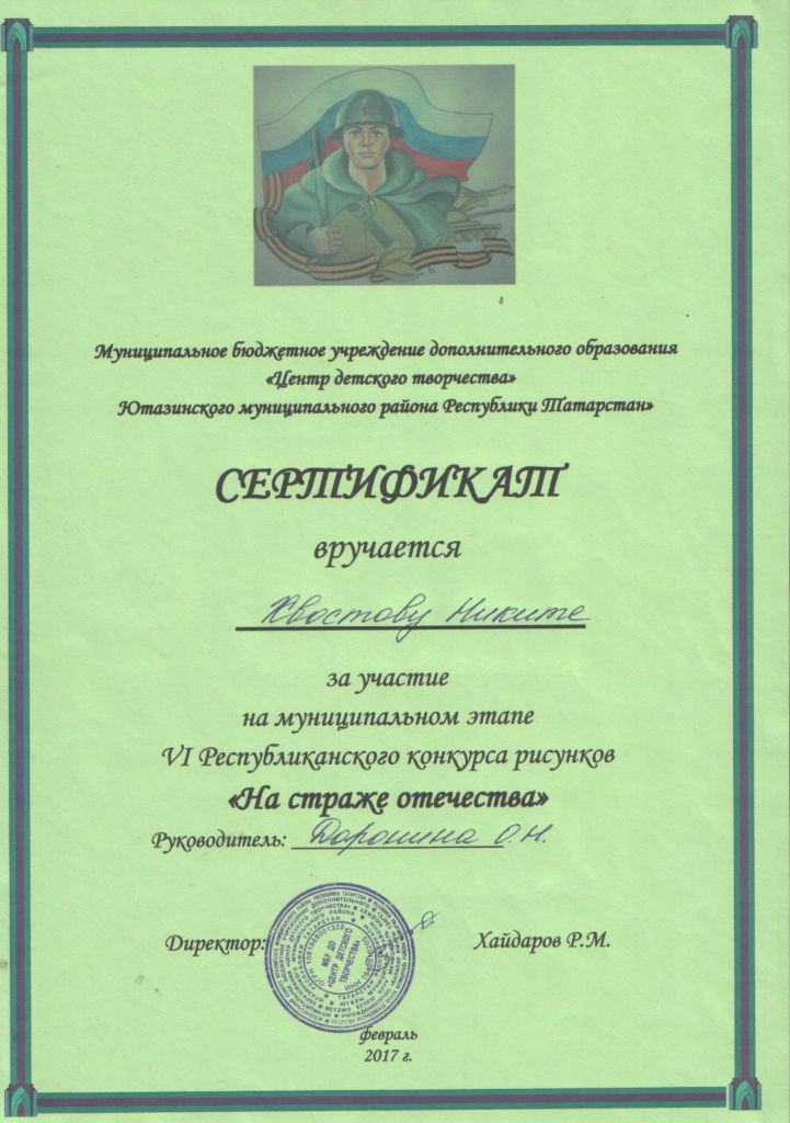 /Сертификат за участие на муниципальном этапе Республиканском конкурсе рисунков "На страже отечества". Хвостов Никита.jpg
