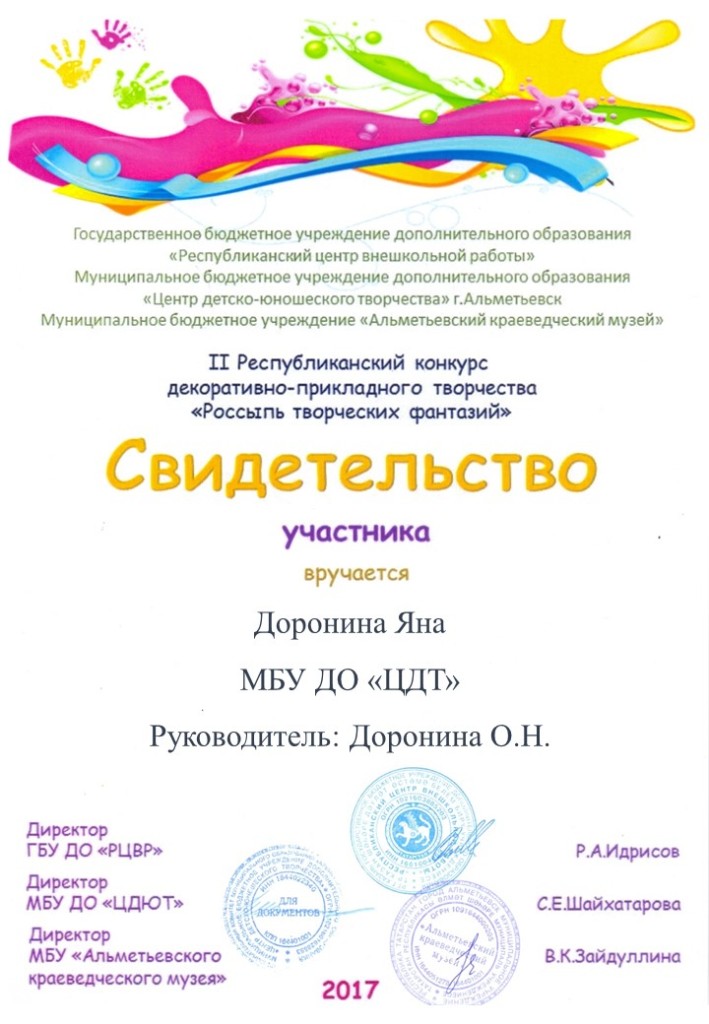 /Свидетельство участника Республиканского конкурса декоративно - прикладного творчества "Россыпь творческих фантазий". Доронина Яна.jpg