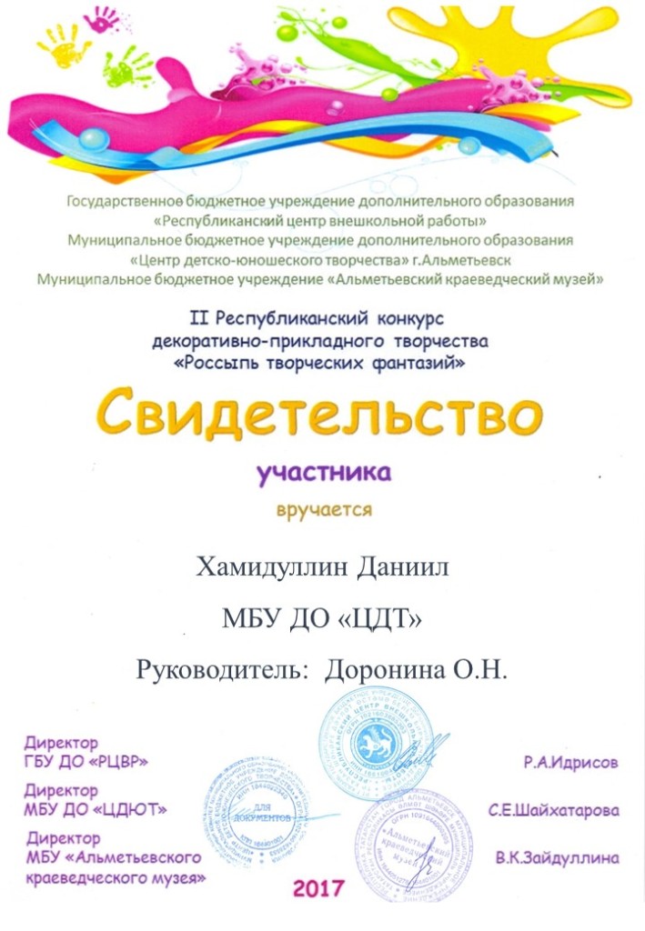 /Свидетельство участника Республиканском конкурсе декоративно - прикладного творчества "Россыпь творческих фантазий". Хамидуллин Даниил.jpg