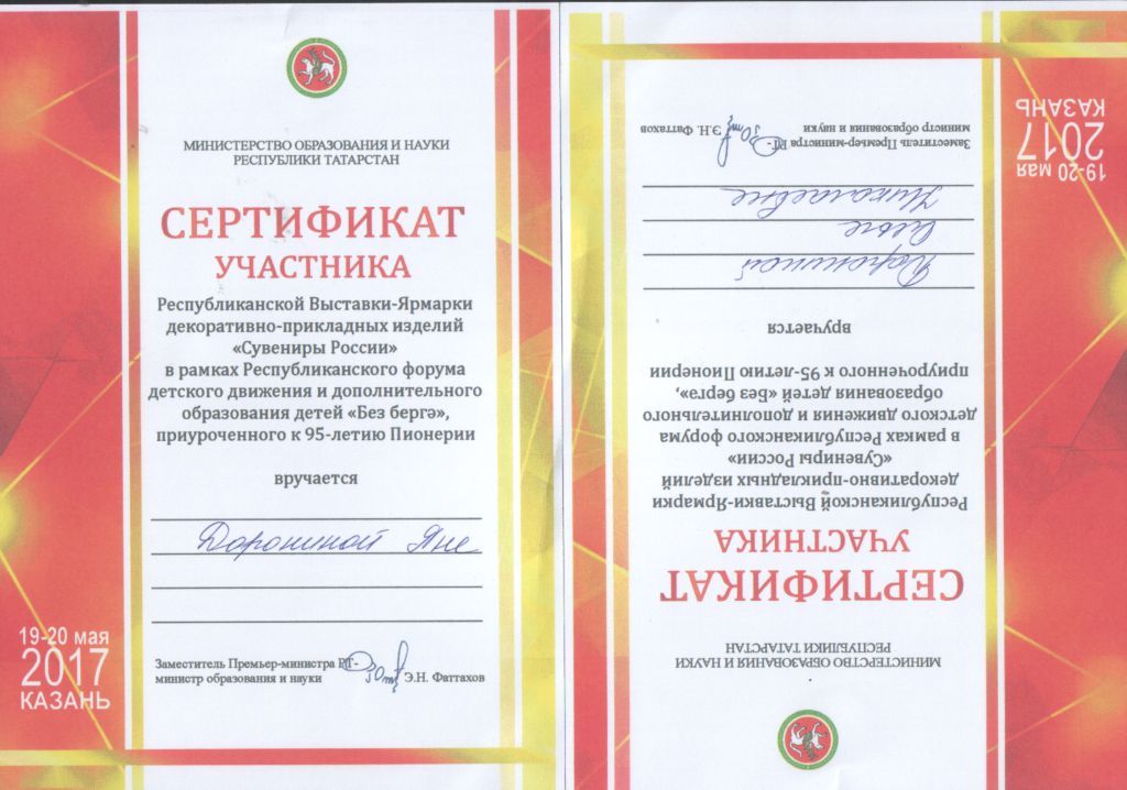 /Сертификат участника Республиканской Выставке - Ярмарке декоративно - прикладных изделий "Сувениры России".jpg