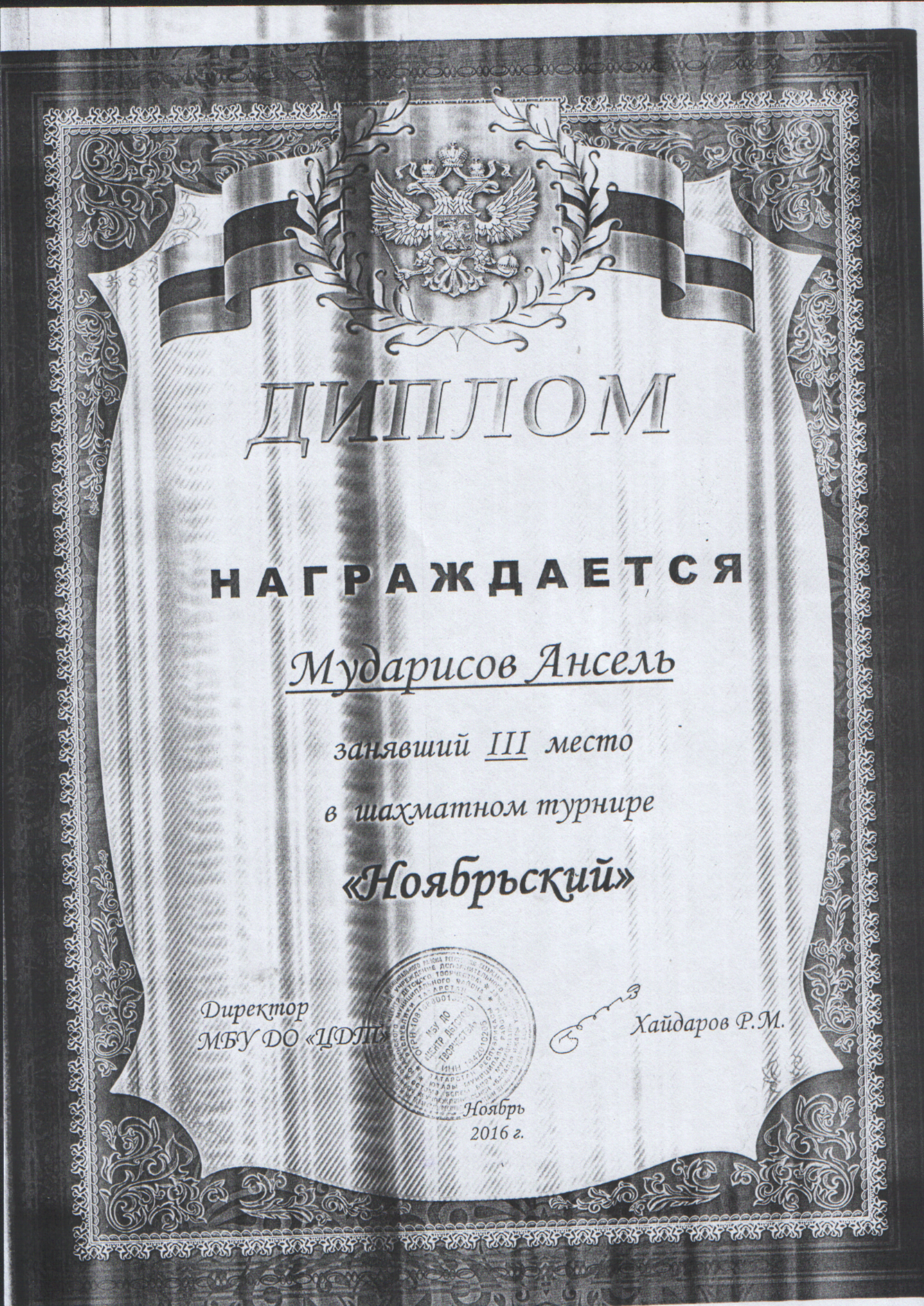 /Диплом 3 степени в шахматном турнире "Ноябрьский". Мударисов Ансель.bmp