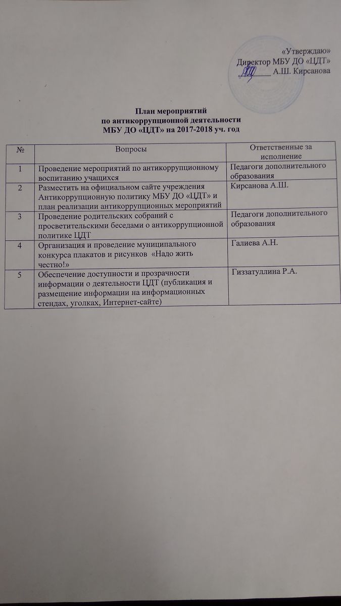 План мероприятий по антикоррупционной деятельности МБУ ДО «ЦДТ» на 2017-2018 уч. год