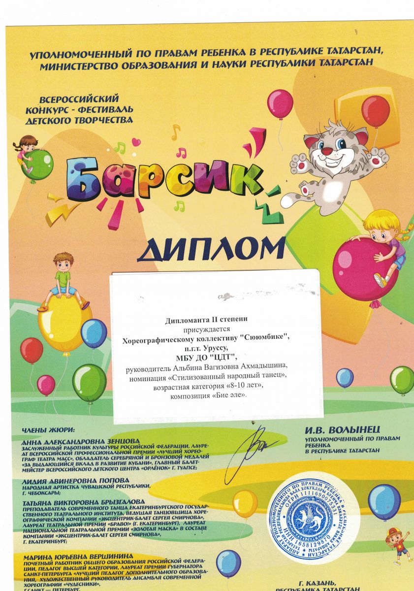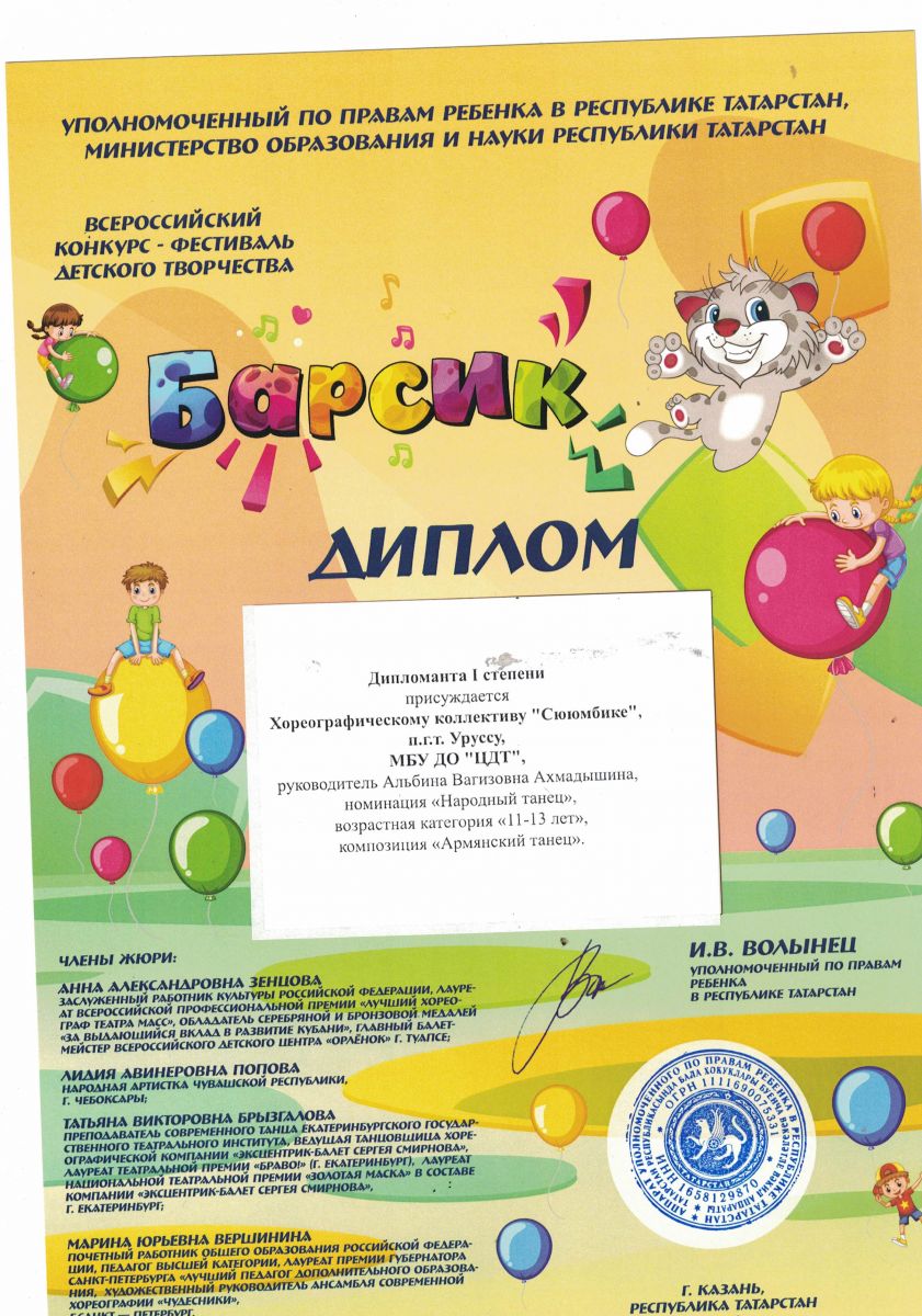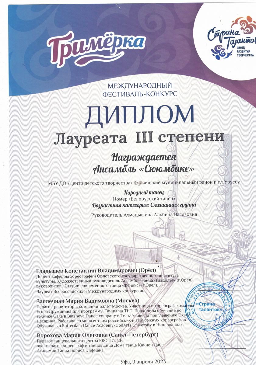 /Диплом 1 степени хорографический ансамбль Сююмбике 7-9 лет Международный фестиваль конкурс.jpeg