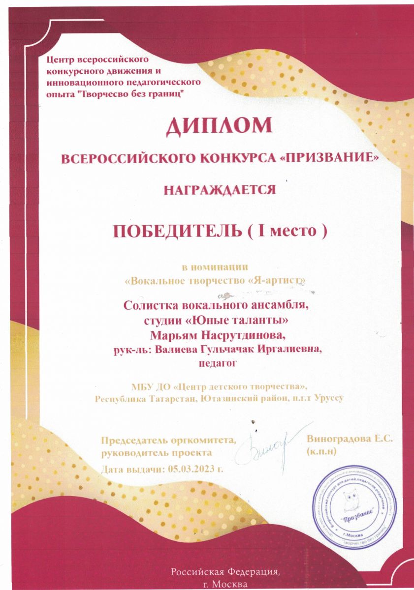 /Диплом 1 место всероссийского конкурса Призвание Марьям Насрутдинова.jpg