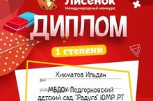Воспитанник детского сада Хикматов Ильдан принял участие в международном конкурсе "Лисенок" и получил диплом 1 степени.