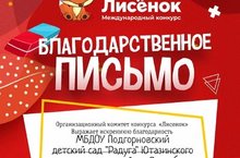 Благодарственное письмо за участие в международном конкурсе "Лисенок" 17.05.2020
