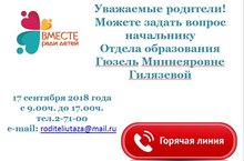 Уважаемые родители! 17 сентября с 9.00 до 17.00 состоится горячая линия с начальником Отдела образования Ютазинского муниципального района Гилязевой Гюзель Миннеяровной. Звонки принимаются по телефону 2-71-00. Электронная почта roditeliutaza@mail.ru