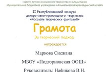 Стали известны итоги II Республиканского конкурса декоративно-прикладного творчества "Россыпь творческих фантазий". Ученица 6 класса С. Маркова получила Грамоту за "Творческий подход", а ученицы 6 класса З. Даниленко и Ю. Власова - свидетельства участников (руководитель В.Н. Нафикова). МОЛОДЦЫ!!!