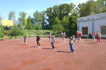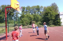 На территории нашей школы установлена баскетбольная площадка, где теперь с удовольствием ребята из пришкольного лагеря "Радуга" утром делают зарядку.