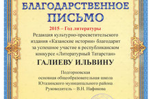 Подведены итоги республиканского конкурса-викторины "Литературный Татарстан". В нём приняла участие ученица 9 класса И. Галиева (учитель В.Н. Нафикова). Она получила Благодарственное письмо от редакции газеты "Казанские истории", набрав 115 баллов.