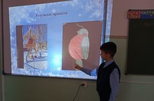Учащиеся 4 класса на классном часу представили проекты "Зимующие птицы". Комиссаров Дамир защитил проект "Снегирь-птица зимняя"