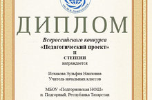 Башлангыч сыйныф укытучысы Исхакова З.Н. һәм инглиз теле укытучысы Хикматова А.М. «Педагогик осталык» Xнчы Бөтенроссия бәйгесендә (Бәйгене оештыручы: М. В. Ломоносов исемендәге Бөтенроссия мәгълүмати-методик үзәк) 2нче дәрәҗә дипломына лаек булдылар. Котлыйбыз!