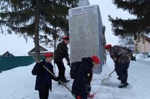 Члены отряда Юнармия провели очистку территории памятника односельчанам, павшим в ВОВ, после прошедших снегопадов.