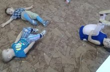 Ясельная группа с воспитателем Солдатенко Г.М. делают утреннюю гимнастику. Упражнение "велосипед" они особенно любят.