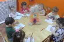 к детям ясельной группы в гости интегрированному НОД (познавательное, художественно-эстетическое развитие) приходил зайка. Дети вместе с зайкой и воспитателем Солдатенко Г.М. повторили названия "чайник, чашка, блюдечко" и для закрепления раскрасили чайник (учились правильно держать карандаш, закрепляли основные цвета (красный, желтый, зеленый).