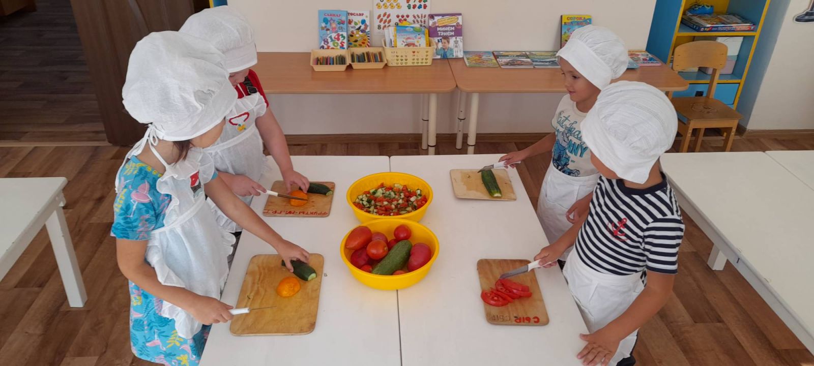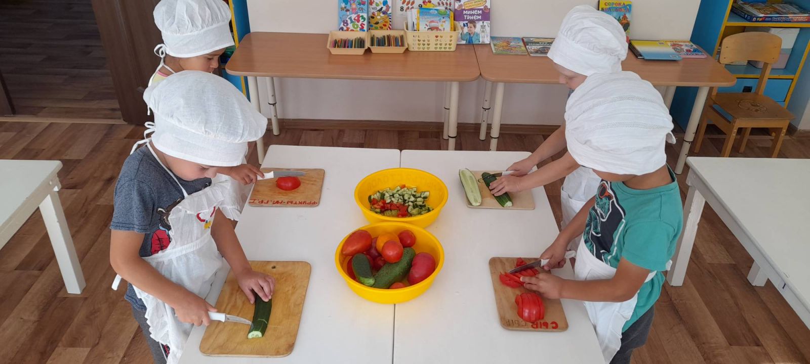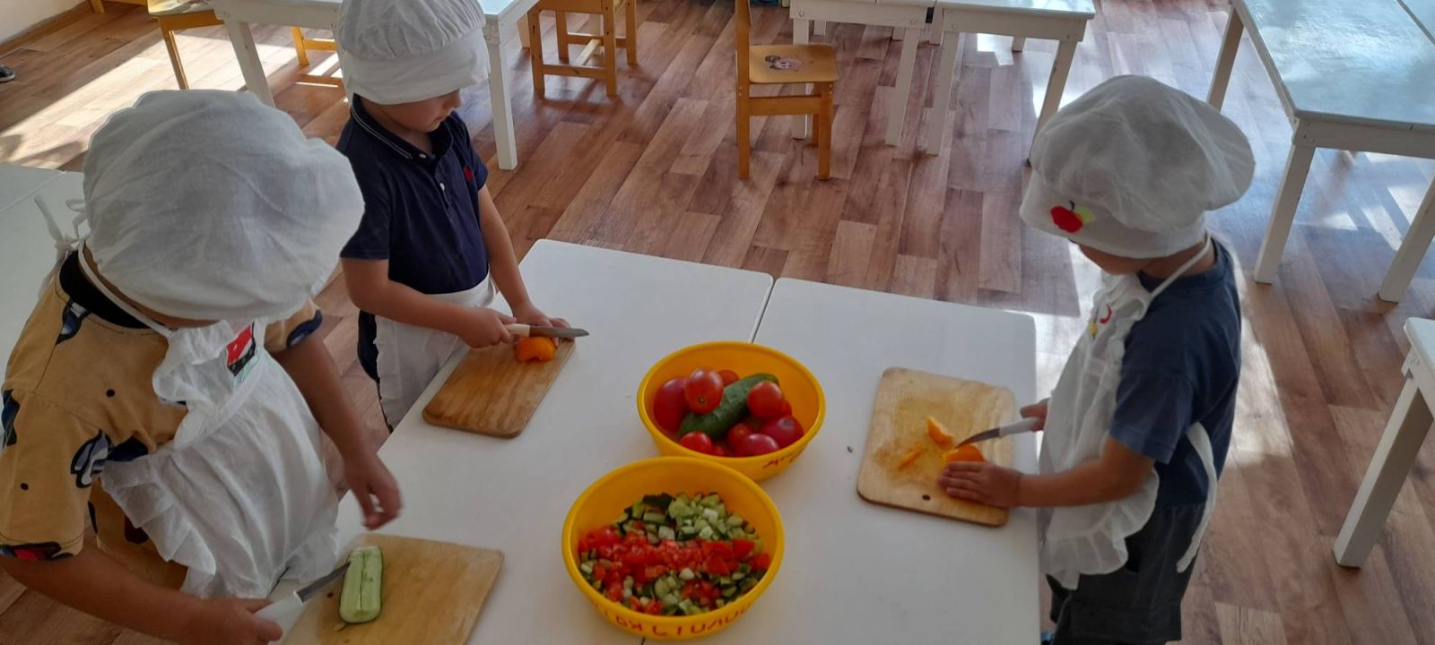 Бүген уртанчы төркем балалары "Витаминнар үз кулларыбыз белән" проекты өстендә эшләделәр. Төшке ашка үзләре файдалы яшелчәләрдән тәмле салат ясадылар.