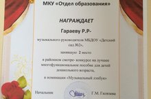 Поздравляем нашего музыкального руководителя Гараеву Резеду Равилевну занявшую 2 место в районном смотре-конкурсе на лучшее многофункциональное пособие для детей дошкольного возраста в номинации "Музыкальный лэпбук" / Мәктәпкәчә яшьтәге балалар өчен күпфункцияле ярдәмлек смотр-бәйгесенең "Музыкаль лэпбук" номинациясендә 2 нче урын алган музыка җитәкчесе Гараева Резеда Равил кызын котлыйбыз.