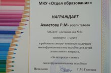 Поздравляем нашего воспитателя Ахметову Розалию Миргасимовну занявшую 1 место в районном смотре-конкурсе на лучшее многофункциональное пособие для детей дошкольного возраста в номинации "За авторские стихи к многофункциональную пособию" / Мәктәпкәчә яшьтәге балалар өчен күпфункцияле ярдәмлек смотр-бәйгесенең "Күпфункцияле ярдәмлеккә автор шигырьләре" номинациясендә 1 нче урын алган тәрбияче Ахметова Розалия Миргасим кызын котлыйбыз.