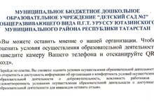 «Вы можете оставить мнение о нашей организации. Чтобы оценить условия осуществления образовательной деятельности наведите камеру Вашего телефона и отсканируйте QR-код. Перейдя по ссылке, Вы сможете: оценить условия осуществления образовательной деятельности: o открытость и доступность информации об организации o комфортность условий осуществления образовательной деятельности o доброжелательность, вежливость работников o удовлетворенность условиями осуществления образовательной деятельности o доступность образовательной деятельности для инвалидов оставить отзыв».