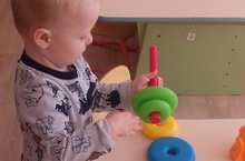 Пирамидку собирает Николаша, младший брат. По колечку одевает. Получилось! Очень рад. 19.09.2019