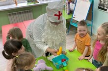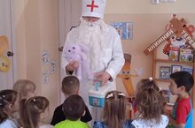 " волшебным " фонендоскопом. В конце встречи похвалил всех и напомнил " Чтобы быть сильными, весёлыми и здоровыми, нужно больше есть фруктов и овощей ". На участке детского сада провели игры