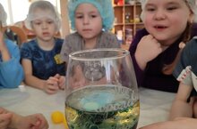 Воспитанники старшей группы "Ромашки" (педагог Мухаметшина Л.И.) провели опыт "Цветная лава", сделали вывод, что вода с маслом не смешиваются, масло поднимается наверх, потому что легче воды, а шипучая таблетка создаёт интересные пузырьки. Восторг детям был обеспечен!