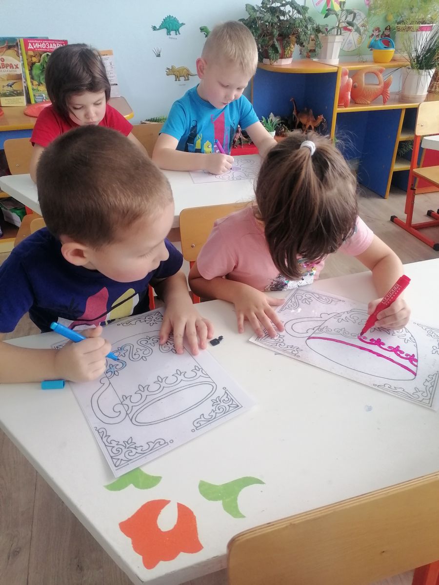 Учить детей сравнивать по признаку цвета, воспроизводить линии в рамках, развивать зрительно - моторную координацию. Задания: Раскрась татарский узор. Өйрәтергә, балаларны чагыштру буенча билгесе төстә, кысаларында линия кабатлау ,үстерергә тамаша-моторную координацию. Биремнәр: татар бизәге яса.