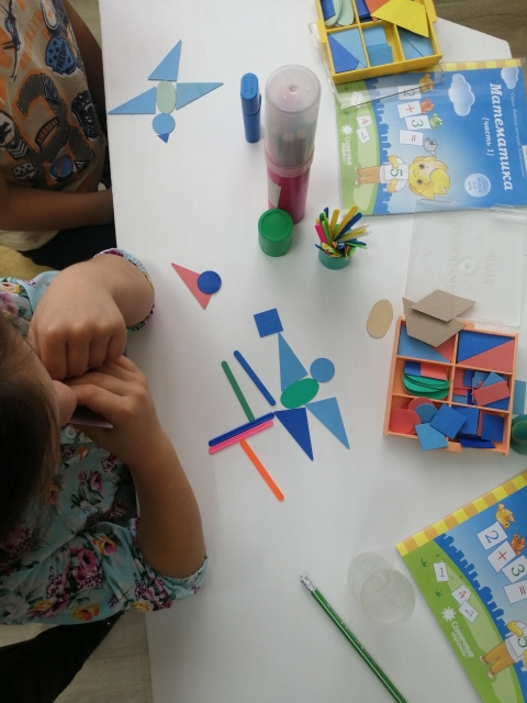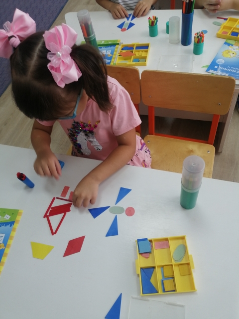 Цель: упражнять в умении составлять различные конструкции из геометрических фигур заданного количества, упражнять в счёте, развивать слуховое внимание, моторику, воображение, логическое мышление.