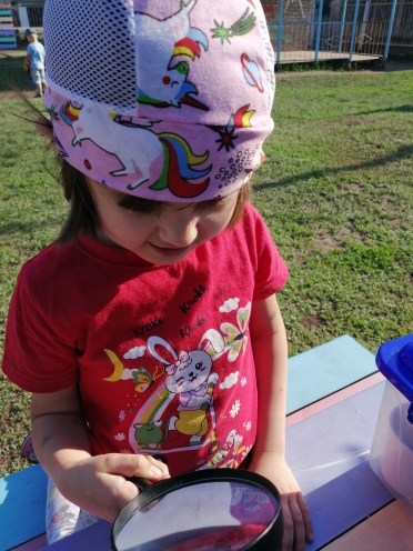 Рассматривание насекомых через лупу.