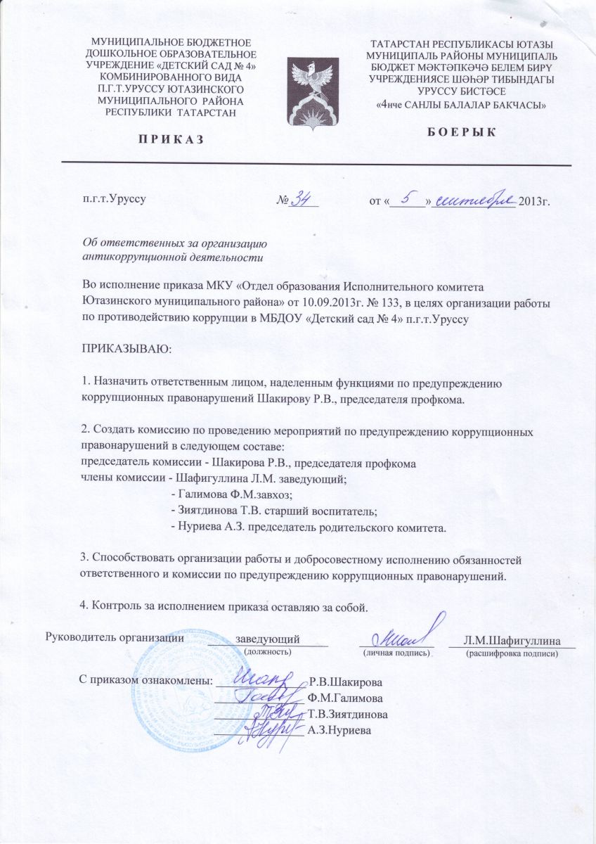 - приказ о назначении ответственного за реализацию антикоррупционной политики