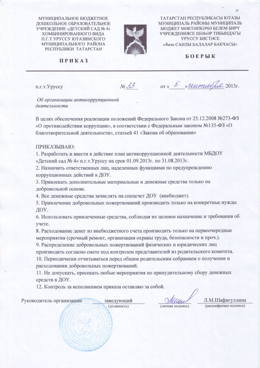 - Об утверждении и введении в действие плана антикоррупционной деятельсноти