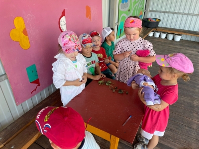 На прогулке понаблюдали за лекарственными растениями, которые растут на территории нашего детского сада. Рассмотрели их внешний вид: листья, цветки, стебли, отметили аромат, также играли в сюжетно-ролевую игру "Больница", прикладывая кукле Маше подорожник к ножке.