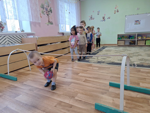 Цель: повторить ходьбу в колонне по одному, развивать глазомер и ритмичность при перешагивании через бруски; упражнять в прокатывании мяча в прямом направлении, в лазанье под дугу.
