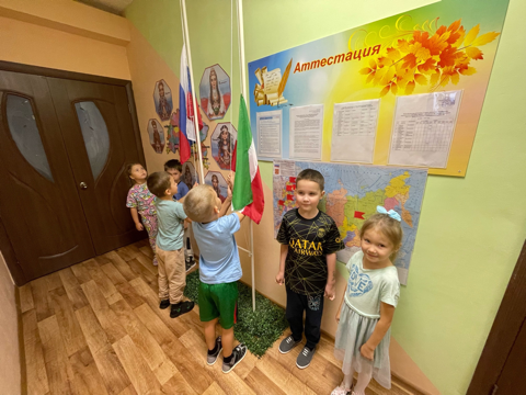 Наши воспитанники, как юные граждане России, уже много знают о символах государства: Флаге, Гербе, Гимне нашего государства. Новым этапом для ребят подготовительной групп стала церемония поднятия Российского флага и Республики Татарстан первое коллективное исполнение Гимна РФ и РТ. Церемония поднятия флага, нашей Родины, будет проходить каждый понедельник.
