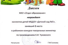Коллектив детей МБДОУ "Детский сад №5" занял второе место в районном конкурсе театральных миниатюр по произведениям К.И. Чуковского.