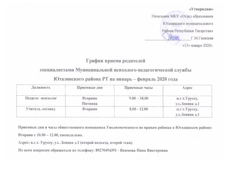 График приема родителей специалистами муниципальной психолого-педагогической службы Ютазинского района РТ