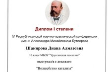 Шакирова Диана, ученица 10 класса МБОУ " Уруссинская гимназия" в номинации "Химия" представила свою проектную работу о механизмах протекания катализа. В своём исследовании она тщательно изучила все аспекты влияния различных условий на скорость химической реакции и достойно защитила свой проект. Работа Дианы была высоко оценёна членами жюри. Подведены итоги - Шакирова Диана удостоена Диплома Первой степени Республиканской научно-практической конференции имени А. М. Бутлерова. -