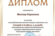 Обучающаяся 2б класса МБОУ "Уруссинская гимназия" Миллер Каролина награждена дипломом Республиканского творческого конкурса эссе "Скорей в Елабугу, в музей!" Желаем новых побед!